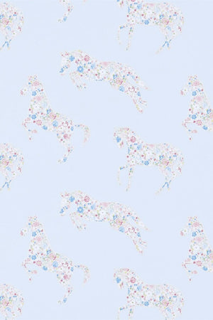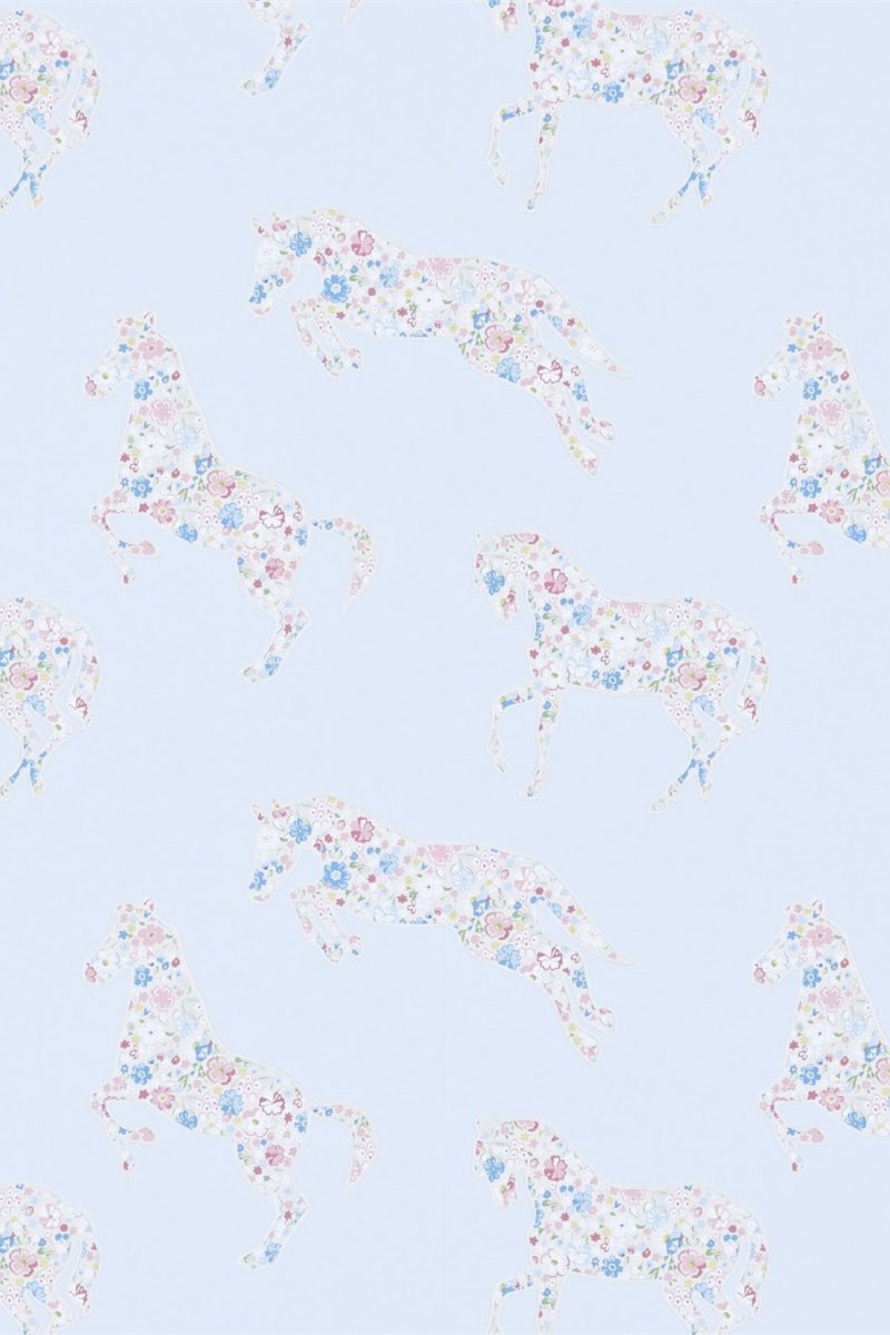 Transform your space into a whimsical wonderland with the Pretty Ponies wallpaper by Sanderson. This charming design features a soft blue background, speckled with an array of delicately prancing ponies. Each creature is adorned with a floral pattern in pastel hues, creating an enchanting scene. Perfect for a touch of playful elegance in nurseries or playrooms, this wallpaper invites a serene yet joyful atmosphere into any room.