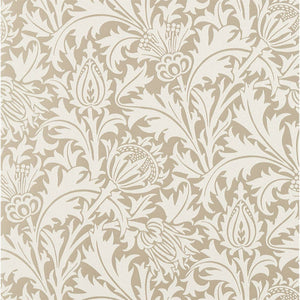 Over-sized, simplified thistle heads framed by scrolling leaves adorn this all-over beaded wallpaper, echoing the neo-Gothic influence of early Morris & Co. This beaded wallpaper is a modern take on a classic design and also available as a non-beaded wallpaper Recommended Paste Elite Ready Mixed Tub Paste. Paste the Paper