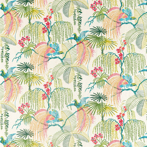 An exciting discovery from the Sanderson archive (drawn by F.M.Barnett c.1961), this intricate design was immediately adopted and translated into this stunning embroidery with its bright array of tropical colours adorning a choice of base cloths.