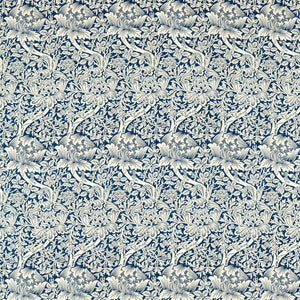 Re-entering the Morris & Co. range for the first time in many years, Rose & Thistle is arranged in a graceful meandering structure with alternating rose flowerheads. Set amongst the foliage, small blooming thistles give this 1881 design an unmistakable character and wild charm. The deep indigo ground offers an almost sculptural quality to this furnishing fabric.
