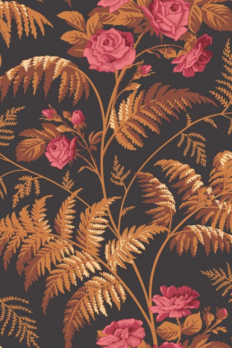 Rose by Cole & Son is a sophisticated, richly hued wallcovering that brings an elegant touch of nature to any room. It presents a stunning chocolate brown backdrop with a lush motif of roses and ferns in shades of pink and amber. The timeless design balances a sense of romantic floral charm with the boldness of its earthy tones, creating a luxurious tapestry that is both comforting and striking. Perfect for creating a focal point or enveloping a space in warmth, this wallcovering is a delightful choice for those seeking a blend of contemporary style and classic floristry.
