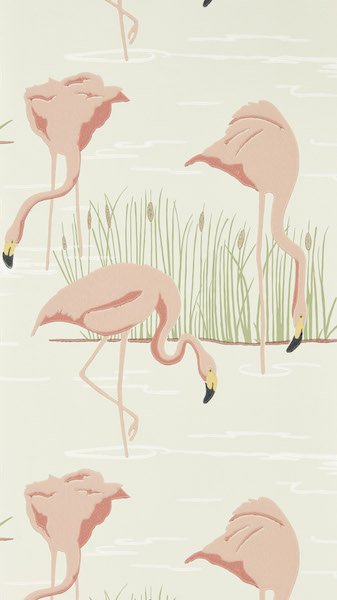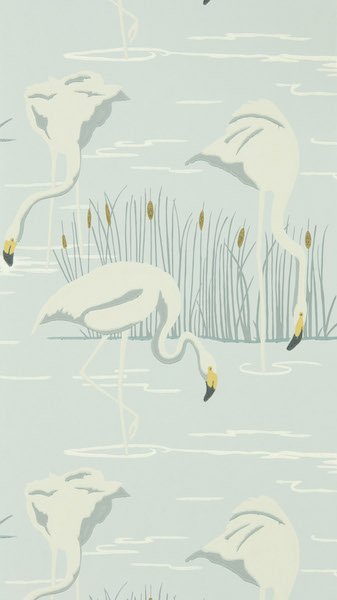 Imbue your space with the tranquil beauty of the Salinas wallpaper by Harlequin. This exquisite wallcovering features an elegant flock of flamingos poised serenely amongst slender reeds, set against a soft, duck egg blue backdrop. The gentle ivory and muted tones of the graceful birds contrast with subtle touches of gold, reflecting a hint of morning sunshine. Perfect for creating a relaxing haven, this design brings a serene, natural ambiance to any room.