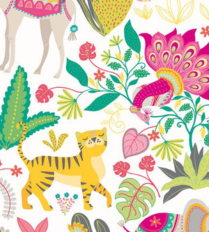 With her head held high, an elegant tiger strides across this colourful kingdom. Nearby, friendly elephants and cheeky camels explore the lush, tropical leaves of their jungle home. Perching high, a peacock tailed bird chitters and chatters, sharing the day’s events from this safari world!