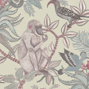 The Savuti Wallpaper by Cole and Son brings the African savannah into the heart of your home with a muted colour palette of greys, pinks, and greens. This charming design features an array of wildlife, including baboons and exotic birds, nestled amongst lush foliage. The intricate detailing captures the essence of the animals and plants, set against a soft, matte background that adds depth and sophistication to any room. Perfect for adding a touch of adventure to your decor.