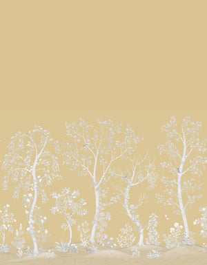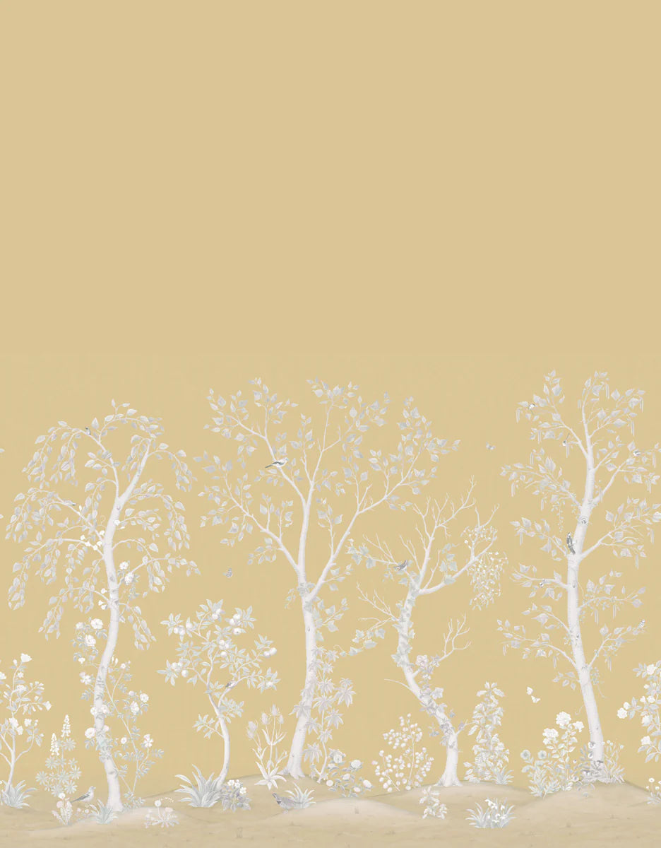 Seasonal Woods celebrates the charming sophistication of unspoilt nature. Maintaining the authenticity of Cole & Son's perennial icon, Woods, Seasonal Woods features silver birch trees painted in a softer hand, surrounded by a symphony of woodland flora and fauna throughout the year. Like a balletic movement, each tree is full of life. Butterflies flutter by, woodpeckers, robins, and other creatures perch in branches with trailing ivy, holly, bramble berries, and apples displaying the bounty of the hedgerow as it changes over the seasons.