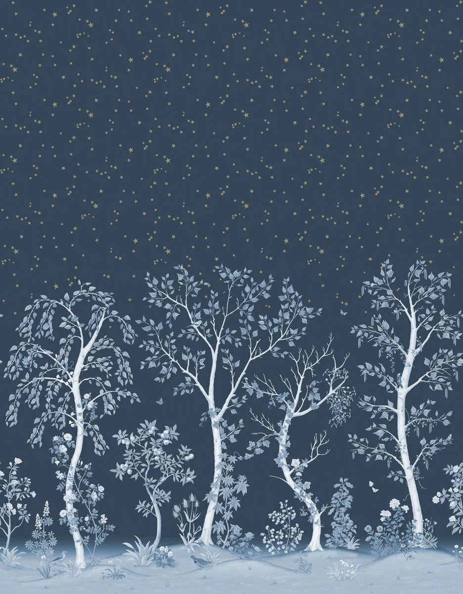 Seasonal Woods celebrates the charming sophistication of unspoilt nature. Maintaining the authenticity of Cole & Son's perennial icon, Woods, Seasonal Woods features silver birch trees painted in a softer hand, surrounded by a symphony of woodland flora and fauna throughout the year. Like a balletic movement, each tree is full of life. Butterflies flutter by, woodpeckers, robins, and other creatures perch in branches with trailing ivy, holly, bramble berries, and apples displaying the bounty of the hedgerow as it changes over the seasons.