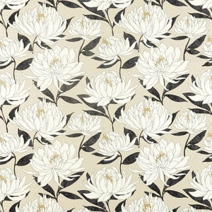 Salinas Prints And Weaves - Sebal. Glorious chrysanthemum flowers with delicate metallic highlights bloom on this cotton-line blend fabric. Available in light, mid and dark colourways, this design is suitable for blinds, curtains and upholstery. A wallpaper of the same name is also available.