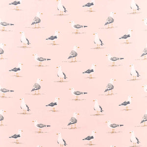 Friendly seagulls perch in the sand on this charming 100% cotton fabric. Originally created with thick layers of gouache paint to give a stylised, brushstroke texture, this design is available in four gentle colourways. Bring the seaside into any room of your home and team with the wallpaper of the same name.