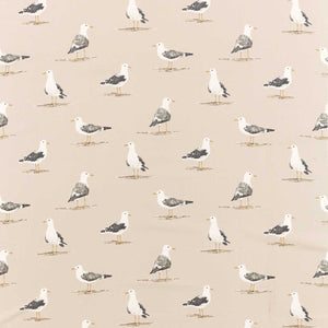 Friendly seagulls perch in the sand on this charming 100% cotton fabric. Originally created with thick layers of gouache paint to give a stylised, brushstroke texture, this design is available in four gentle colourways. Bring the seaside into any room of your home and team with the wallpaper of the same name.