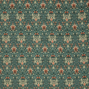 Printed for the first time on a sumptuous velvet Snakeshead was originally designed by William Morris in 1876. The dramatic flame like motif and alternating spiky clusters of foliage seem held in suspension by the delicate scrolling tendrils that form the pattern`s background.