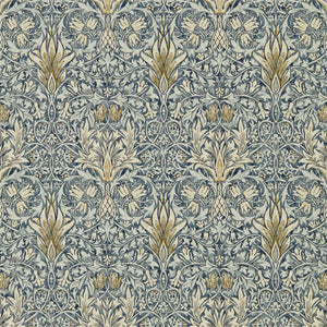 Immerse your space in the timeless elegance of the Snakeshead wallpaper by Morris & Co. This exquisite design features a harmonious colourway of muted blues, soft creams, and delicate golds that intertwine to create a sophisticated and serene ambience. The iconic Snakeshead pattern, inspired by nature, exhibits elegantly stylised florals and intricate foliage, meticulously detailed to bring a touch of the natural world indoors with a classic yet fresh appeal.