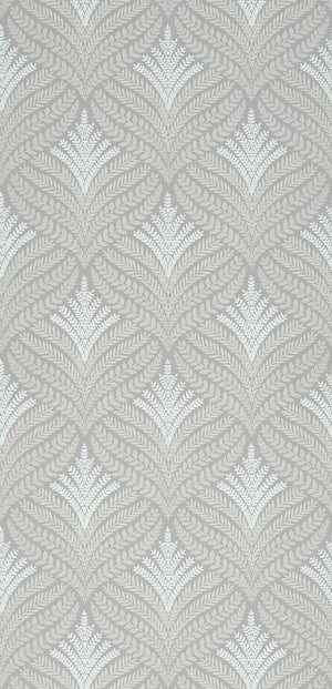 Introducing Sotherton by Osborne & Little, a serene and elegant wallcovering that gracefully transforms any space. The depicted colourway features a soft grey palette, imparting a tranquil and sophisticated ambience. Its design showcases an intricate fern motif, artfully arranged in a symmetric herringbone pattern. This captivating design is steeped in classic charm while maintaining a contemporary edge, making it an ideal choice for those seeking to blend timeless elegance with modern flair.