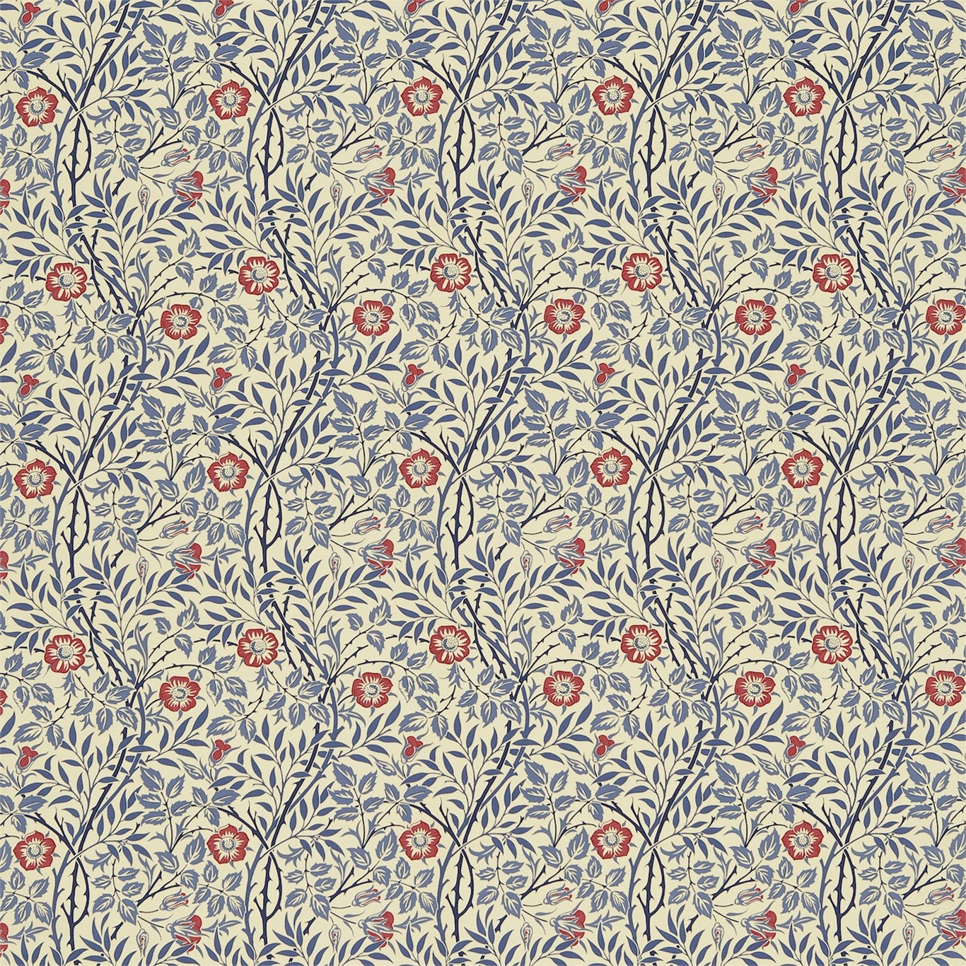 Designed by J.H. Dearle in 1912 Sweet Briar depicts roses entwined around rambling thorny stems. Also available in wallpaper.