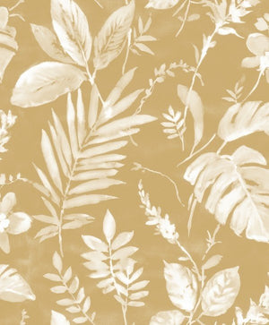 Adorn your walls with the charming elegance of the Tane Leaf wallpaper by Muriva, beautifully presented in a warm, gold colourway. This design boasts a medley of delicate botanical motifs, artistically rendered in a soft, creamy white, which gracefully contrasts against the rich backdrop. The lush array of foliage brings a touch of nature's tranquillity into your home, while the metallic sheen adds a subtle hint of luxury, making it a perfect backdrop for both contemporary and traditional interiors.
