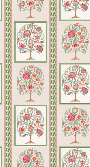 contemporary tree-of-life designs with paisley flowers, presented within picture frames adorned with gold inlay, all within a lattice border stripe. Taniska is a Hindu name, meaning Goddess of Gold.