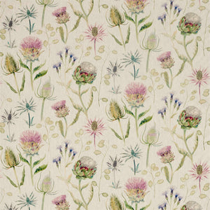 This enchanting 100% linen fabric design portrays strong thistle shapes alongside delicate seedpods, punctuated by lively bursts of colour. Use this design to create eye-catching curtains in an otherwise neutral scheme.