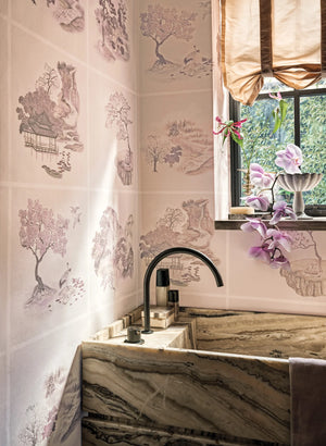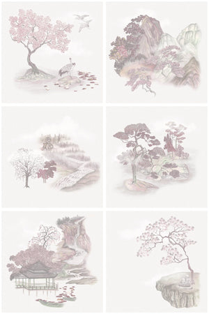 Connected to Pavilion and Mountainscape, Tile Toile depicts key scenes that were inspired by the beautiful landscapes of Silver Pavilion in Kyoto. The tile like structure of the design mirrors traditional Japanese wall art and flirts with a Toile de Jouy. Each tile depicts a still life scene, however when viewed as one, it tells a harmonious story of the historical gardens.
