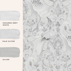 Exude timeless elegance with the Tregaron Wallpaper by Laura Ashley, showcased here in a sophisticated palette of sugared grey, white, pale silver, and silver. This wallpaper pattern features an intricate display of florals and peacocks, exquisitely detailed to lend an air of classic charm to any room. Each stroke and shading is carefully crafted to create a serene and graceful ambiance, offering a perfect blend of tradition and tranquility for your home decor.