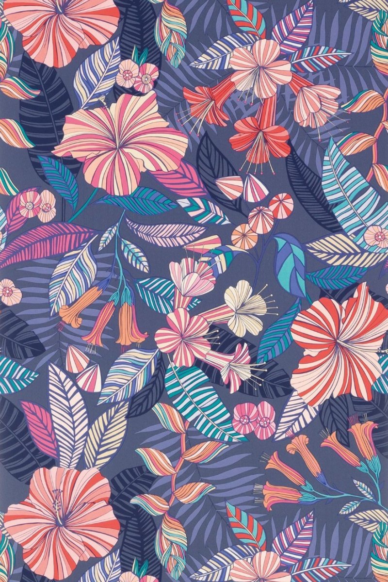 Immerse your space in the vibrant charm of the Valldemossa wallpaper by Matthew Williamson. This pattern boasts an eclectic palette of blush, coral, and periwinkle hues, set against a dusky lavender backdrop. Each flourish is a celebration of nature's splendour, featuring whimsical leaves and blooming flowers. An artistic layering effect gives life to the design, inviting a sense of dynamic movement. Transform your home with this delightful blend of colour and botanical grace.