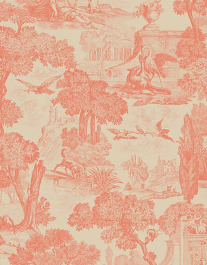 The Versailles wallpaper by Cole and Son offers a lavish visual treat, adorning walls with scenes reminiscent of classical French gardens. This particular colourway features a warm apricot hue on a muted, textured background, evoking a soft, yet vibrant atmosphere. Every panel showcases a rich tapestry of nature and sculptural elements—graceful trees, whimsical birds, and elegant statues, alongside scenes of leisure that bring the outdoors into any space with sophistication and style.