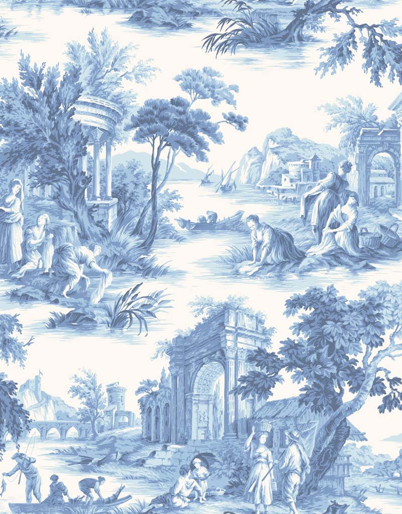 Immerse yourself in the classic elegance of the Villandry wallpaper by Cole and Son, adorned with a serene blue and white colourway that elicits the charm of vintage toile de Jouy. The intricate design portrays idyllic pastoral scenes featuring romantic figures, ancient structures, and lush landscapes. This timeless wallpaper brings a touch of aristocratic countryside nostalgia to any room, creating a tranquil backdrop with its delicate hues and detailed artistry.