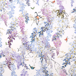 Beautiful butterflies and birds dart between branches of a blossoming wisteria on this 100% linen fabric design. A stunning addition to rooms when used as curtains and blinds.