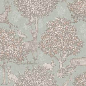 This woodland scene wallpaper features deer's, birds, and rabbits along with orchard style trees for a country effect wallpaper. The wallpaper design is perfect for creating a cosy and inviting space with a whimsical design on a sage backdrop. This paper works perfectly on a feature wall or chimney breast, paired with painted walls in pale creams or stronger tones. It's an ideal option for a kitchen or garden room, dining room or hallway.